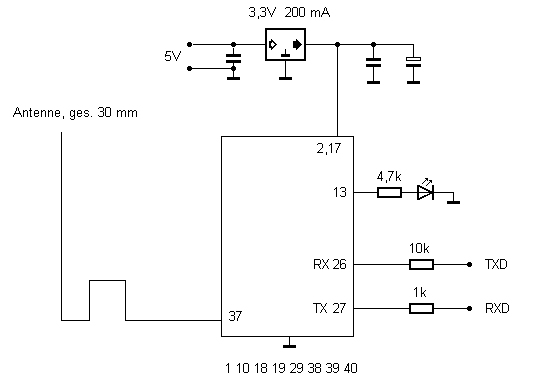 Betriebsspannung 3,3 V, RXD und TXD. Zusätzlich ein Stückchen