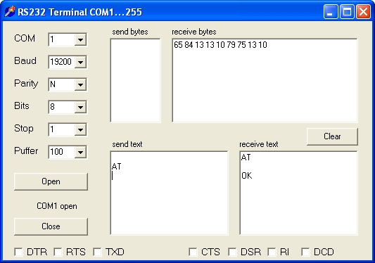 erste Test lautet AT <Enter>, die Antwort ist OK.