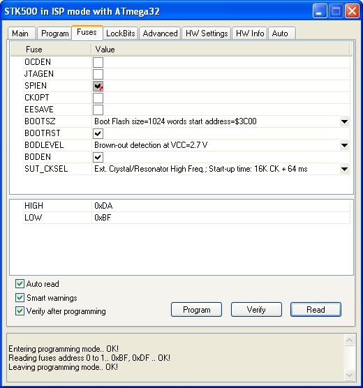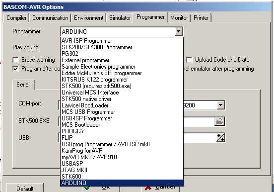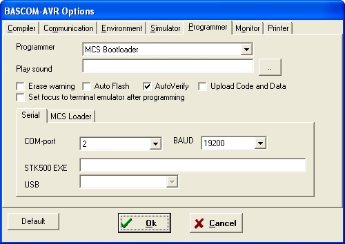 Nach dieser Vorbereitung kann man einen beliebigen Quelltext für den Mega32 in Bascom laden, kompilieren und mit Program/Send to chip in den Controller übertragen. Es funktioniert wahlweise über USB oder RS232, kein externes Programm mehr! Ist bereits ein Programm geladen, muss beim nächsten mal zuerst mit Program/Send to chip der Bootvorgang beauftragt werden und dann einmal kurz auf den Resetknopf des ES-M32 gedrückt werden. Dann startet der Ladevorgang. Nach dem Laden startet das neue Programm von allein.