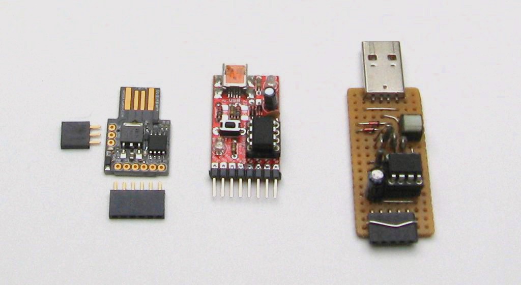 Beide Konzepte basieren auf Mikrocontrollern ATtiny 85 und weisen wie die grossen Arduinos einen USB-Anschluss und einen Bootloader auf. Da die VUSB-Library auf die "Kleinen" portiert wurde, kann man sogar einige virtuelle USB-Geräteklassen damit realisieren. Konzipiert sind sie aber eher als winzige Arduino-Varianten, die man einmal programmiert und dann (mitsamt der dann nutzlosen USB-Hardware) in einem vom PC unabhängigen Projekt verbaut. Man kann in seinem Projekt die USB-Pins mit verwenden, so dass man immerhin 5 IOs zur Verfügung hat. Für viele Anwendungen wird das reichen, und man hat dann nur 9 Euro versenkt statt 25 Euro für ein "ausgewachsenes" Arduino-Board (das Olimex-Board in der Mitte kostet als Bausatz sogar nur unter 5 Euro).