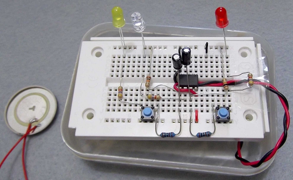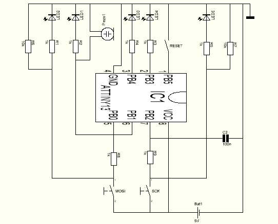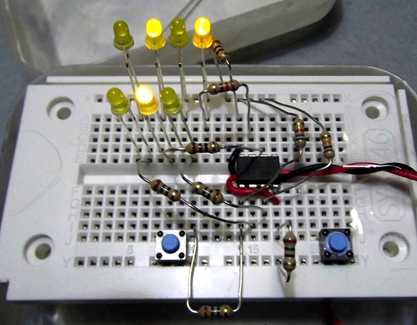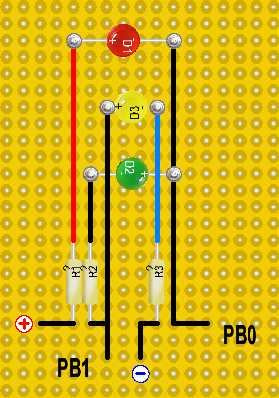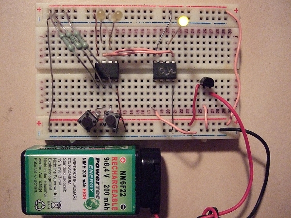 (4,5V), Steckbrett, Tiny13, 2x Tasten, Draht, 5x 1k, 2x 10k, je 2x LED