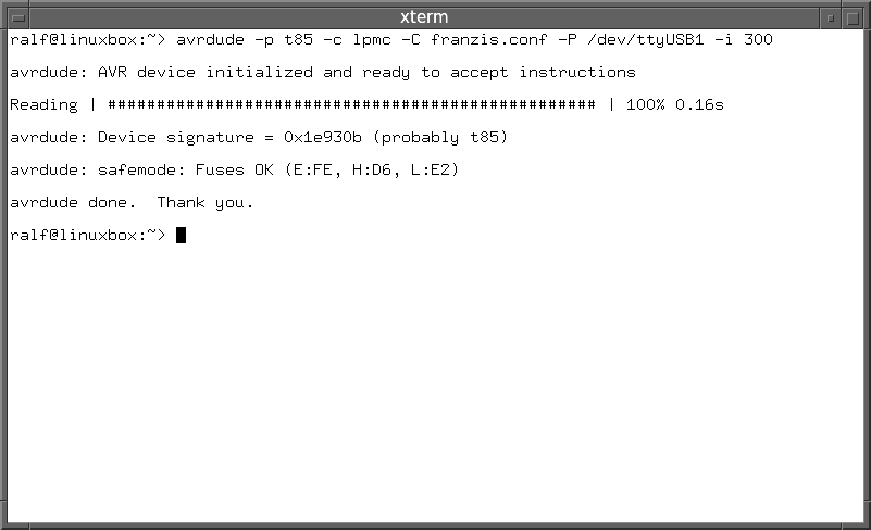 avrdude -p t85 -c lpmc85 -C ~/franzis.conf -P /dev/ttyUSB2 -i 300