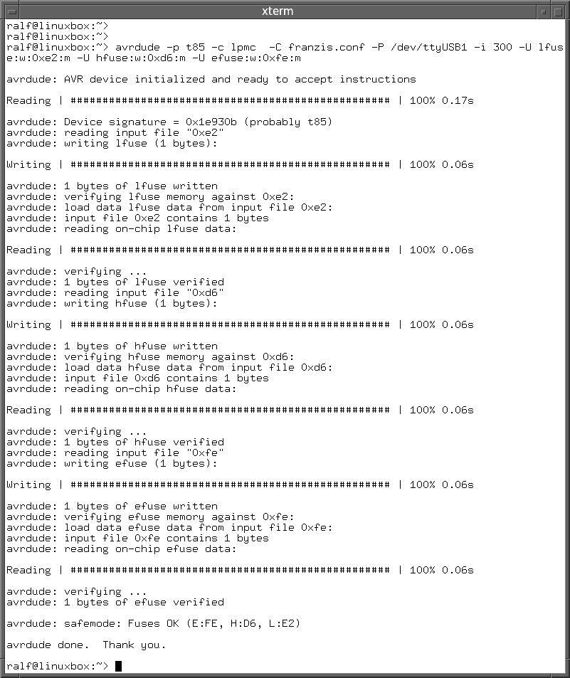 avrdude -p t85 -c lpmc85 -C franzis.conf -P /dev/ttyUSB2 -i 300 -U lfuse:w:0xe2:m -U hfuse:w:0xd6:m -U efuse:w:0xfe:m