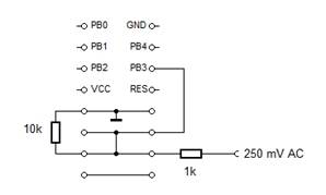 der Messbereich daher auf 250 mVeff (=354 mVs) begrenzt. Ein Spannungsteiler 1