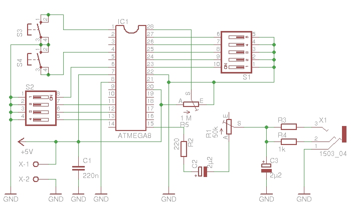 Atmega8 arbeitet mit 1 MHz Takt aus dem internen RC- Oszillator; ein