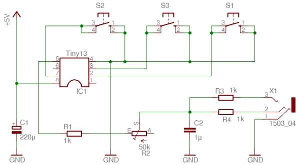 An PB0 des AtTiny liegt der Tiefpass für das Ausgangssignal, ansonsten ist keine weitere Hardwarebeschaltung erforderlich (außer dem Stützkondensator für die Betriebsspannung).
