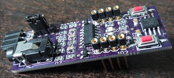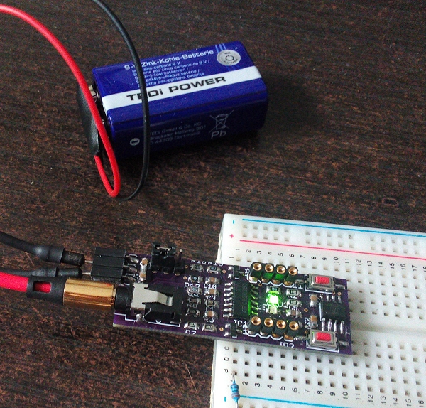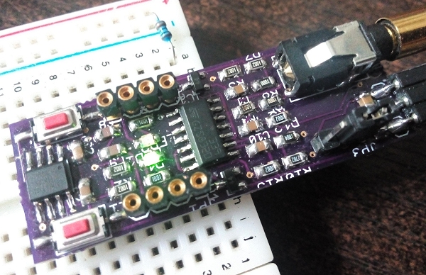 Mikrocontroller ist jetzt ein Tiny25. Eine Audio-Buchse ist gleich mit