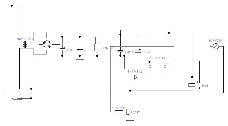 Der 8-beinige Chip ist sehr vielseitig einsetzbar, falls man ihn wie nachfolgend erläutert, Intelligenz "einprogrammiert". Mit der Schaltung können, je nach Anwendung, bis zu vier Taster (B1 bis B4) abgefragt werden. Das erfolgt prellfrei, nicht benötigte Taster werden nicht angeschlossen. Dabei ist B0 der zu schaltende Ausgang. Hier folgt eine Transistortreiberstufe (T1) und schließlich ein Relais (Rel). Der Vorteil dieses Konzepts ist die galvanische Netztrennung. Es können für o.g. Taster sogar "Klingeltaster" und entsprechende Leitungen benutzt werden. Natürlich könnte man eine Optokoppler-Triac Kombination benutzen. Diese Variante liegt bei mir auch vor, hat aber nicht den oben erwähnten Vorteil der Netztrennung. Außerdem benötigt man einen Triac, der in dem zu schaltenden Strombereich (bis 5A) schon einen beachtlichen Kühlkörper benötigt, was das Gerät vergrößern würde. Als Trafo reicht ein Typ von 50 bis 100 mA aus, da die Gesamtstromaufnahme  nur vom aktivierten Relais bestimmt wird und die des Chips vernachlässigend klein ist.