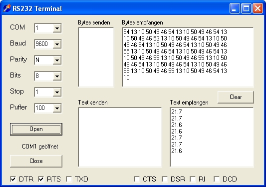 Das fertige Messergebnis erscheint nun im Terminal. Man muss übrigens DTR und RTS einschalten, um den Controller mit Spannung zu versorgen.