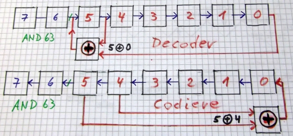 Decodiert: d=(c0 xor c5).c5.c4.c3.c2.c1=a5.a4.a3.a2.a1.a0