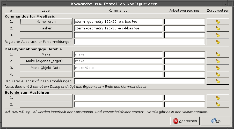 "Erstellen - Kommandos zum Erstellen konfigurieren" das Öffnen von