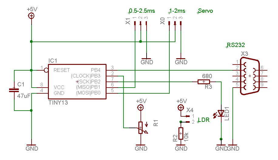 Ohne Servos kann man damit eine Spannung digitalisieren und an den PC übertragen. Mit einem Servo gibt es ein Servo-Voltmeter. Die LED kann Grenzwerte der Spannung anzeigen und mit einem LDR am Eingang des ADC wird Licht gemessen, der Servo dreht von dunkel nach hell.