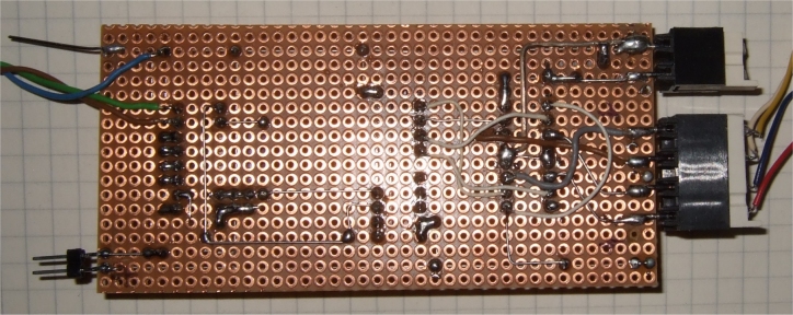 Die Platine, rechts der Anschluss für den Schrittmotor und die Spannungsversorgung für den Motor
