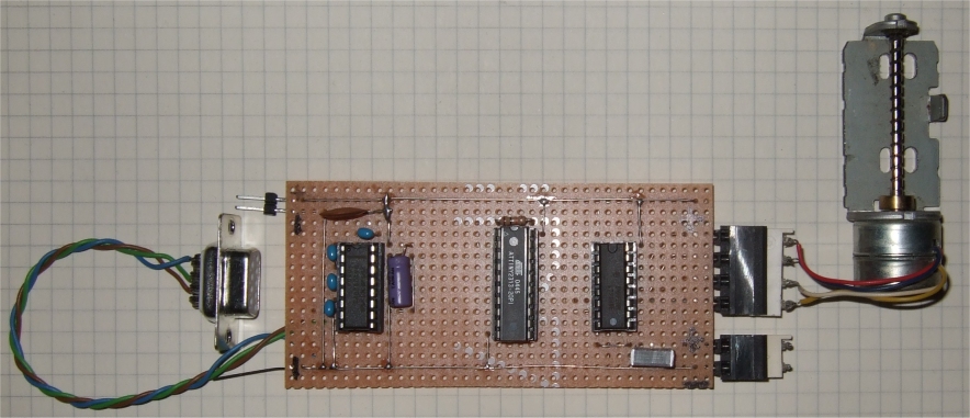 Die Ansteuerung des L293 übernimmt ein ATtiny2313, die Sequenz dafür ist in einer Tabelle abgelegt, die zyklisch durchlaufen wird. Die Signale sind an PB0 bis PB3. Das Ganze ist in Assembler, so ist es schnell. Der ATtiny2313 wird über die serielle Schnittstelle programmiert, als Pegelwandler für RS232 dient ein MAX202. Folgende Kommandos sind möglich: