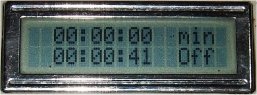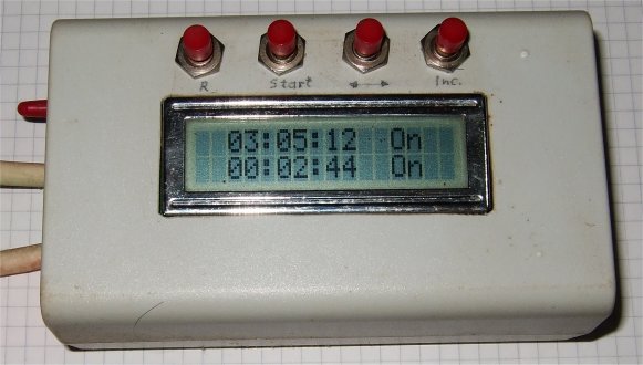 On the left is the reset button which will reset the timer and turn off the relais. The next is the start button, the display shows the programmed time in the upper line, 3 hours, 5 minutes and 12 seconds, and the lower line shows the time since the start button was pressed, 2 minutes and 44 seconds in this case and it shows that it is on. There is also a red led to show it's on.