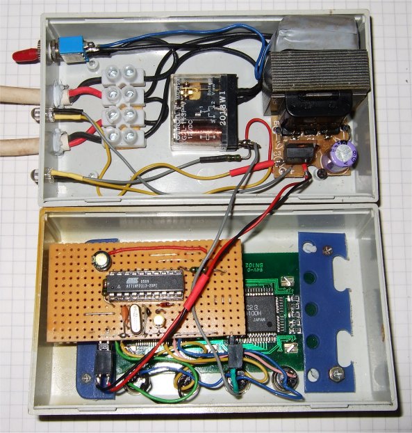 The circuit diagram, S4 is the reset button, and S3 is a pushbutton to start the timer. S1 and S2 will pull Int1 low through the diodes and in the interrupt routine the level on PD5 or PD4 determines which button was pressed., either the ↔ button or the inc button. On PD1 is a short signal when the time is elapsed, maybe could be connected to a buzzer, but I have not used it. PD6 is the timer output which is high when the timer is on, this turns on the transistor and the relais. Timing is controlled by the 4 MHz quartz crystal.