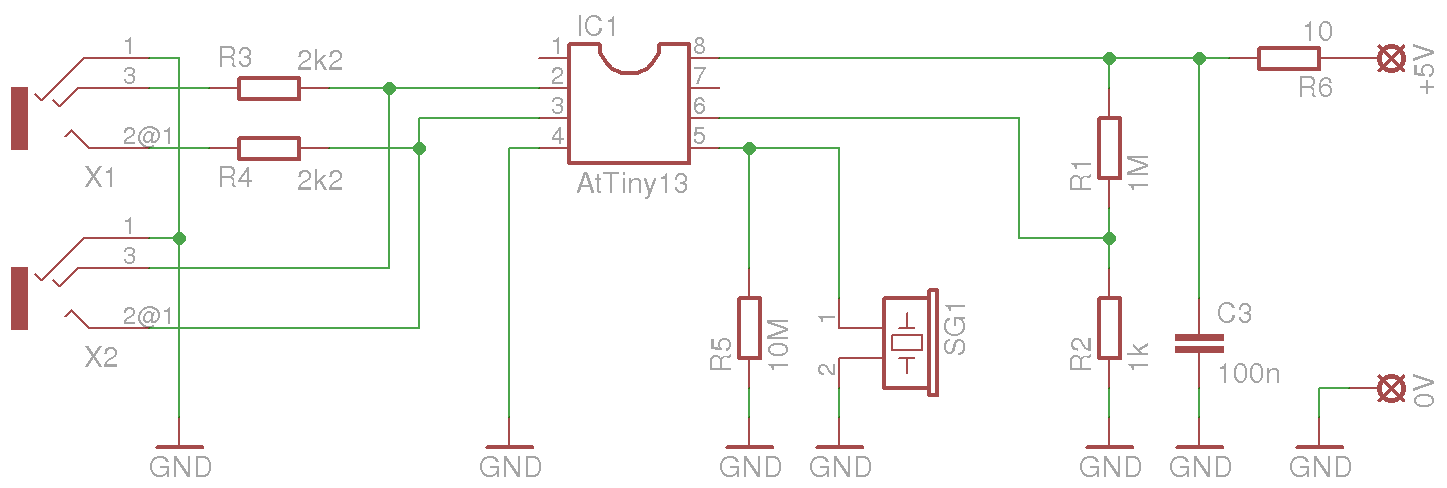 aus. Ein ATtiny13 schließt auf Knopfdruck das Audiosignal für eine