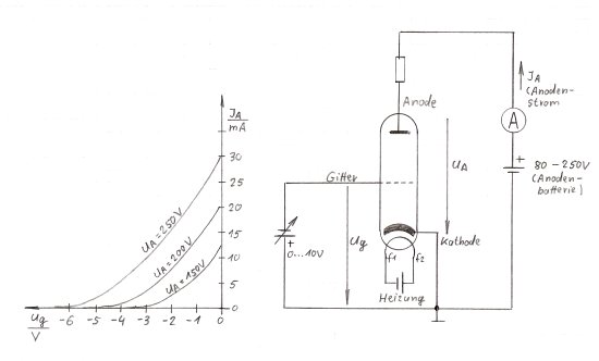 und Gitter. Die Kathode wird mit dem negativen Pol, die Anode mit dem