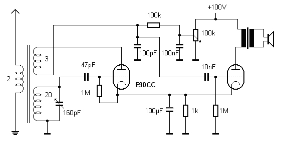 Schaltung. Die Rückkopplung muss über die Anode und eine getrennte