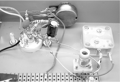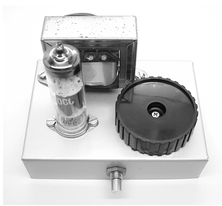 Hier ein Aufbaubeispiel für das Radio. Als Chassis dient ein Aluminium-Gehäuse. Die Röhrenfassung und der Drehko sind auf die Oberseite montiert, ein zusätzliches Poti an die Frontseite. Als Ausgangsübertrager dient ein 100-V-ELA-Übertrager.