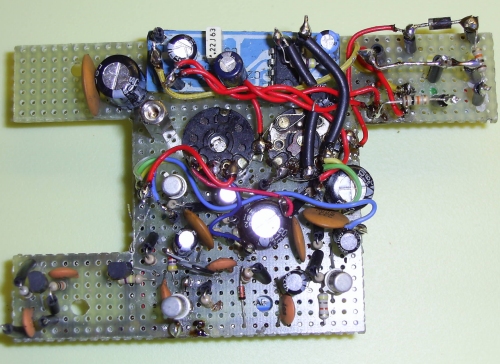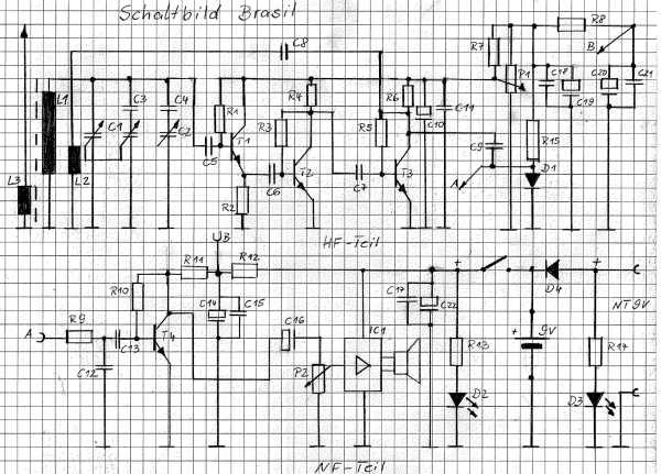 Die Dioden-AFC gleicht durch ihren Eingangswiderstand, der sich entsprechend der Eingangssignalgröße ändert, Lautstärkeschwankungen in einem bestimmten Regelbereich aus. Die Transistorbestückung des Gerätes im HF-Teil (2xBF 199, 1x BC 108 B) muss im Interesse der Funktionsfähigkeit unbedingt eingehalten werden. Bei dem BC 108 B lohnt sich das Messen des hFE (Stromverstärkung). Diese Funktion ist in fast allen Digitalmultimetern vorhanden. Die mir zur Verfügung stehenden BC 108 bewegen sich in einem Bereich von 340 bis 540 - facher Verstärkung. Die Schaltung funktioniert zwar mit jedem hFE, ein hoher Stromverstärkungswert ist aber zu bevorzugen. Im Mustergerät befindet sich ein Transistor mit 540. Als NF Verstärker (IC 1) kann jeder beliebige NF-Schaltkreis eingesetzt werden. Auf der Platine des Brasil ist noch eine zweite NF Vorstufe vorhanden, die aber auf Grund der hohen Verstärkung des verwendeten IC nicht genutzt wird.