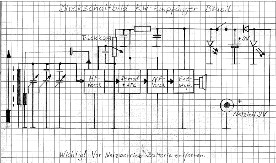 Bei dem Brasil handelt es sich um einen Rückkopplungsempfänger mit Dioden-AGC. Er empfängt den Bereich 5500 KHz bis 13800 KHz. In diesem Bereich befinden sich die Rundfunkbänder 49m, 41m, 31m und 25m.