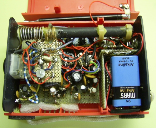 Die Teleskopstabantenne trägt durch Variieren ihres Aufstellwinkels zur Empfangsverbesserung bei. Für die Grobeinstellung der Empfangsfrequenz wird ein AM/FM Foliendrehko eingesetzt, bei dem beide AM Pakete genutzt werden. Er entspricht dem im Franzis verwendeten Drehko (2x 180pF bei Stellung Abstimmtrimmer auf volle Kapazität). Ein zweiter, baugleicher Drehko übernimmt mit einem seiner FM Pakete (15pF) die Feinregelung. Im Mustergerät befindet sich ein reiner FM Foliendrehko (2x 2,5pF bis 23pF), bei dem nur ein Paket angeschlossen ist. Das Prinzip des Rückkopplungsempfängers besteht darin, dass fast so viel HF Energie auf den Schwingkreis zurück geführt wird, dass seine eigenen und die durch Last entstehenden Verluste ausgeglichen werden.