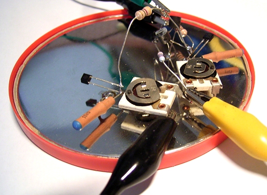 Wenn ich nun an beiden Potis abstimme, entsteht an den meisten Stellen nur eine Schwingung, wahlweise mit hoher oder niedriger Frequenz im Mittelwellenbereich. Bei ganz bestimmten Einstellungen aber beginnt das Chaos!