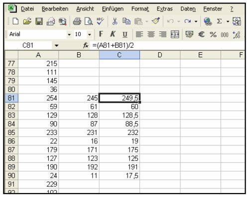 7. Die zugehörigen Tabellenwerte selektieren und für mehrere Ausschnitte Mittelwerte errechnen lassen.