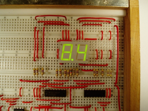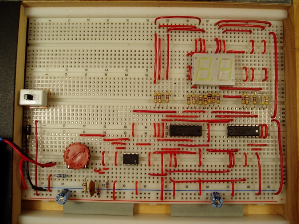 Die folgende Abbildung zeigt ein Aufbaubeispiel. Man darf sich von der Menge der Drahtbrücken nicht verwirren lassen. Am besten verdrahtet man erst den linken Dezimalzähler und prüft ob die 7-Segmentanzeige korrekt funktioniert. Hat man dies geschafft, dann ist das Verdrahten des rechten Zählers auch kein Problem mehr. Schließlich wird noch der Tiny13 angeschlossen und alles überprüft.
