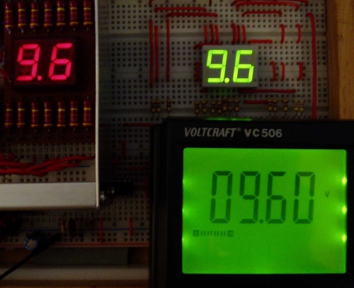 Benutzt man die interne Spannungsreferenz von 1,1 V so kann man mit dem vorgeschlagenen Spannungsteiler Spannungen von 0,0 bis 9,9 V messen. Die Auflösung beträgt dabei 100 mV. Das ist für die meisten Hobby-Anwendungen ausreichend. Natürlich kann das Prinzip auch auf eine 3-Stellige Anzeige erweitert werden.