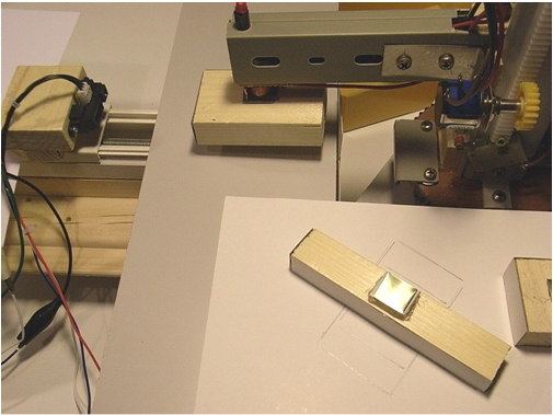 Beim Experimentieren ergab sich, dass ich den Distanz-Mess-Sensor in einem bestimmten Bereich zur Erfassung der Breite von Objekten verwenden konnte, die vor ihm von einem Robotermodell platziert wurden, wie es im nächsten Bild dargestellt ist. Das breite rechteckige Stück Holz wurde gerade in einem markierten Bereich (rechts unten im Bild) aufgenommen und danach etwas angehoben. Das Robotermodell drehte anschließend seinen Körper so, dass der Sensor das Objekt erfassen konnte. Der Mikrocontroller unterscheidet je nach Abstand des Distanz-Mess-Sensors von dem betreffenden Holzstück an Hand der eingelesenen Werte, ob es sich um ein schmales, ein mittleres oder ein breites Objekt handelt, oder ob kein Objekt vor ihm vorhanden ist. Er sendet das ermittelte Byte an den PC und lässt zusätzlich jeweils eine grüne, eine gelbe oder eine rote LED (2mA-Typen) aufleuchten, die über Vorwiderstände von jeweils 4,7kOhm zwischen PB0, PB2 und PB4 sowie Masse (GND) angeschlossen sind.