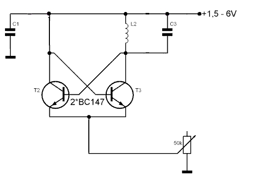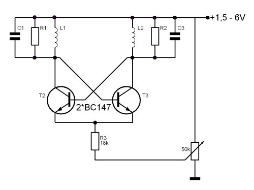 Das schöne an der Schaltung ist ja, dass ein 2-Pol Resonanzkreis genügt um einen Oszillator zu erhalten. In der Schaltung oben ist das Prinzip nicht sofort zu erkennen. Darum habe ich die Schaltung umgezeichnet.