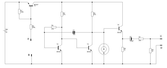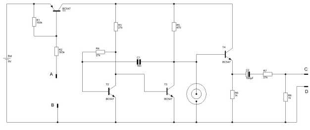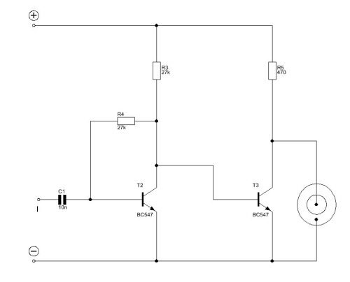 Der Durchgangsprüfer besteht aus den beiden Schaltungskomponenten Oszillator und Schaltstufe. Der Oszillator ist mit den Transistoren T2 und T3 als mitgekoppelter zweistufiger Verstärker aufgebaut. Dies hört sich jetzt zunächst einmal etwas geschwollen an gibt aber im Kern die entscheidenden Bedingungen wieder, die für einen Oszillator notwendig sind, nämlich Verstärkung und Mitkopplung. Wenn wir den Kondensator C1 zunächst vom Ausgang abklemmen und etwas umzeichnen, so erhalten wir zwei hintereinandergeschaltete Verstärkerstufen in Emitterschaltung.