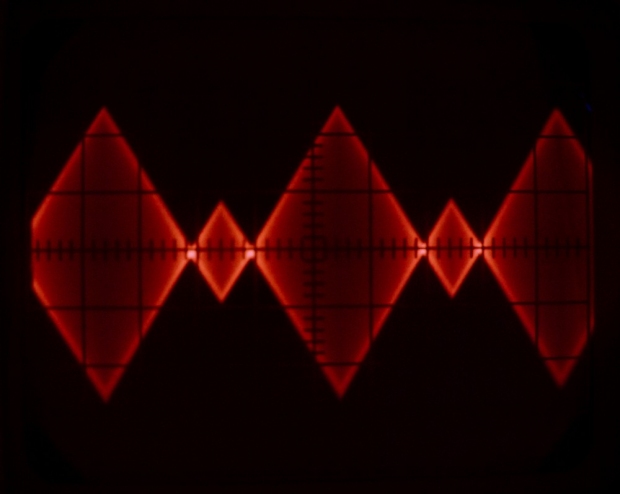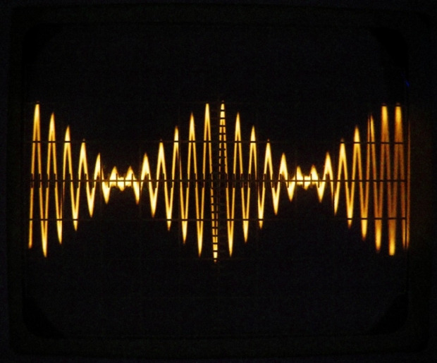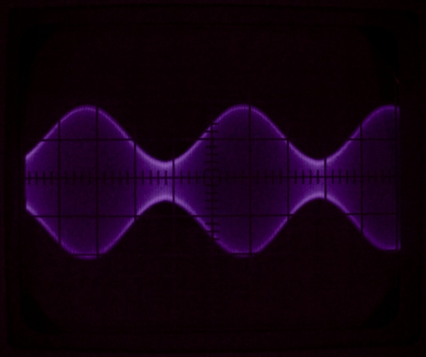 Der mit „C" bezeichnete Kondensator bestimmt den Frequenzbereich. Werte zwischen 1 nF und 1000 nF liefern Frequenzen von einigen 100 Hz bis zu ca. 1 MHz. Das Modulationssignal wird am Eingang „Mod In" eingespeist. Wenn man nicht bereits einen Funktionsgenerator zur Verfügung hat, kann man sich damit behelfen, dass man die Schaltung zweimal aufbaut und den Signalausgang der 2. Schaltung nach entsprechender Pegelanpassung als Modulationssignal verwendet.Die entstehenden Signale müssen damit nur noch auf einem Oszilloskopschirm dargestellt und mit einer Digitalkamera abfotografiert werden. Dabei kann es vorteilhaft sein, extern auf das Modulationssignal zu triggern um eine jitterfreie Darstellung zu erhalten. Die nachfolgenden Bilder zeigen entsprechende Aufnahmen. Damit diese nicht nur in der immergrünen Phosphoreszenzfarbe der verwendeten Kathodenstrahlröhre erscheinen, wurden die Farben der Photos mit Hilfe des PCs und der bereits erwähnten Bildbearbeitungssoftware verändert - fertig sind die Kunstwerke.