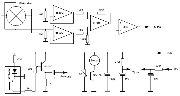 Flügel und Messelektroden werden aus Platinenmaterial ausgesägt. Der Motor zur Drehung des Flügels stammt aus einem CD-Laufwerk. Die Messelektroden bilden eine sehr hochohmige Spannungsquelle, sodass als Eingangsverstärker eine Schaltung mit hohem Eingangswiderstand verwendet wird. Auf diesen Eingangsverstärker folgt eine Differenzstufe. Dadurch wird nur die eigentliche Messspannung verstärkt. Gleichtaktspannungen und Störspannungen die auf beide Elektroden gleich wirken, erscheinen nicht oder nur stark gedämpft am Ausgang des Differenzverstärkers. Die auf den Differenzverstärker folgende Treiberstufe sorgt mit ihrem niedrigen Ausgangswiderstand für eine störarme Übertragung des Signals auch über lange Zuleitungen. Insgesamt werden für im Eingangsteil vier Operationsverstärker benötigt die beim Baustein TL 084 in einem Gehäuse untergebracht sind. Ein weiterer Bestandteil des Messkopfes ist die Reflexlichtschranke vom Typ SFH 9202, welche aus der Rotation des Flügels das für den Synchrongleichrichter benötigte Referenzsignal generiert.