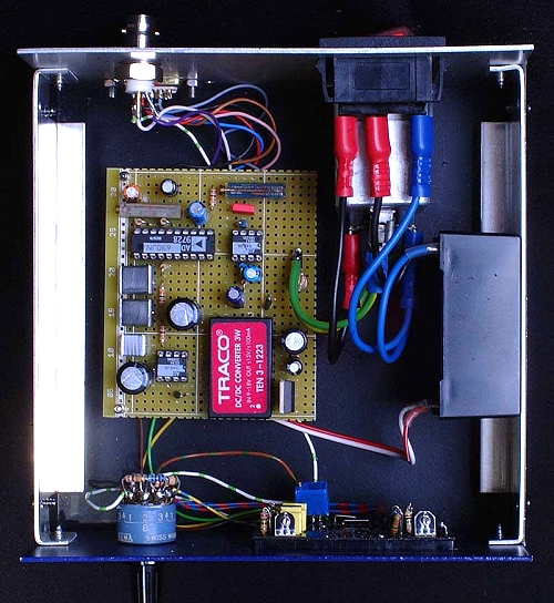 Zur Messwertanzeige wird ein Einbauvoltmeter verwendet. Mit einem Spannungsteiler zwischen Tiefpass und Voltmeter kann der Messbereich des Gerätes verändert werden. Hat man ein Voltmeter mit umschaltbarem Dezimalpunkt eingebaut kann dieser mit einer zweiten Ebene des Bereichschalters umgeschaltet werden. Die Ausgangsspannung des Tiefpasses wird zusätzlich an einer BNC-Buchse auf der Rückseite des Gerätes heraus geführt. An dieser Buchse kann ein externes Messgerät und ein Computer angeschlossen werden. Durch die Aufzeichnung der Messdaten mit einem Computer können auch lange dauernde Messreihen dokumentiert werden. Da die meisten Einbauvoltmeter eine Betriebsspannung benötigen die von der Messspannung galvanisch getrennt ist, wird zur Versorgung der Schaltung ein DC-DC Wandler eingesetzt. Das Gerät kann dann mit einer einfachen 9..12 Volt Spannungsquelle betrieben werden.