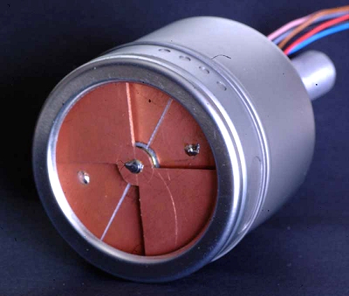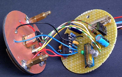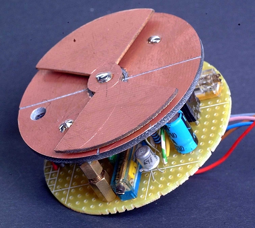 Die Metallisierung der oberen Platine ist durch Ritzen mit einem scharfen Messer in vier getrennte Sektoren unterteilt. Durch das Loch auf der linken Seite blickt die Reflexlichtschranke auf die Rückseite des rotierenden Flügels. Die Rückseite des Flügels ist weiß lackiert um ein höheres Lichtschrankensignal zu erzielen. Die Metallbelegung auf der Vorderseite ist über die Motorachse mit der Gerätemasse verbunden. Die Drehgeschwindigkeit des Rotors sollte möglichst hoch sein. Der Drehzahl sind allerdings durch die unvermeidliche Unwucht Grenzen gesetzt. Mit einem Regler kann die Drehzahl auf ein passendes Maß eingestellt werden.