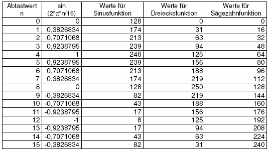 Tabelle 2 gibt dazu die Werte für die 16 Abtastwerte an. Ebenso sind