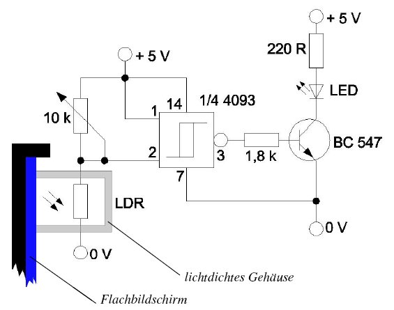 Die Animation kann natürlich auch so eingestellt werden, dass sie beim letzten Bild stehenbleibt. Nun müssen die Informationen nur noch ausgelesen werden. Dies kann sehr einfach über ein LDR-Array direkt vom Bildschirm des Computers geschehen. Das LDR-Array kann z. B. mittels einer Klammer oder Klebestreifen lichtdicht am Monitor befestigt, und das Bildbearbeitungsprogramm-Fenster, das die Animations zeigt, beliebig vergrößert oder verkleinert und an entsprechender Stelle geschoben werden. Hier ein Aufbauvorschlag für eine Steuerleitung: