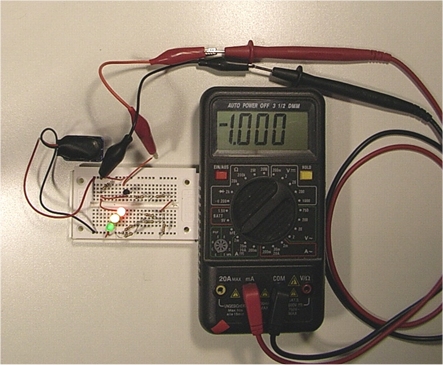 Im Bild ist die Schaltung im Betrieb dargestellt. Die konstante Stromstärke beträgt 1 mA. Als Lastwiderstand dient das Digital-Multimeter, dessen Messbereich auf 2 mA eingestellt ist.