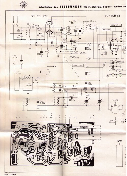 Meist liegt das Brummen an einem ausgetrockneten Siebelko. Hier ist es ein Doppeleko mit 65 µF und 50 µF. Eine zweite mögliche Ursache liegt in einem schlechten Koppelkondensator zwischen NF-Vorstufe (EABC80) und Endstufe (EF84). Wenn dadurch eine Gleichspannung an das Gitter 1 der Endstufe gelangt, steigt der Anodenstrom stark an und überlastet das Netzteil. Um diesen Fall auszuschließen, wurde die Spannung am Kathodenwiderstand (68 Ohm) gemessen. Hier fand sich eine Spannung von 3 V. Der Kathodenstrom beträgt also 44 mA, was zu den Angaben im Schaltbild passt.