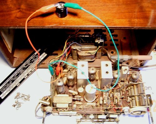 Damit blieb nur noch der Siebelko. Ich wollte ihn aber nicht auslöten, sondern einen neuen Elko einfach parallel schalten. Dazu musste das Chassis aus dem Gehäuse genommen werden. Mit Krokoklemmen wurde der neue Elko mit 47 µF/350 V zuerst probeweise an der Kathode der Si-Diode angeschlossen, aber ganz vorsichtig, weil die hohe Spannung nicht ungefährlich ist.