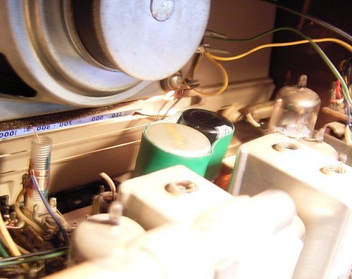 Dieser Versuch war erfolgreich, das Radio zeigte kein Brummen mehr. Deshalb wurde der Elko über ein Kabel verbunden und mit Isolierband an dem originalen Elko befestigt. Dann konnte das Chassis wieder eingebaut werden.