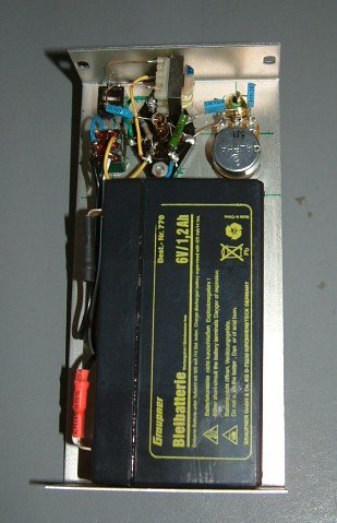 Gerät mit einem 6 Volt Bleiakku aus dem Modellbau. Die Schaltung ist