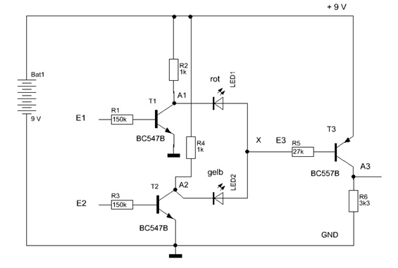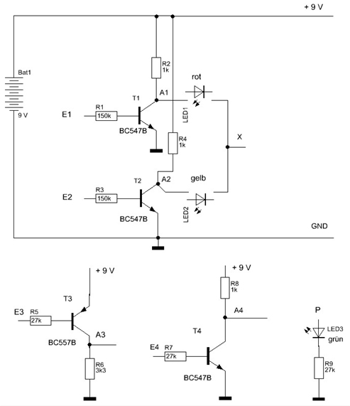 Werden im Schaltungsteil oben die Leuchtdioden LED1 und LED2 in der dargestellten Richtung zwischen X und A1 bzw. A2 eingefügt, sowie x anschließend mit E4 verbunden, entsteht ein UND-Gatter. Beim Anschließen von E1 und E2 an den Pluspol der Batterie werden die Transistoren T1 und T2 leitend, und infolgedessen ist dann T4 gesperrt. An seinem Ausgang kann nahezu die Spannung der Batterie gemessen werden(Zustand 1, High-Pegel). Der Anschluss P der Leuchtdiode 3 ist mit A4 verbunden. Am Ausgang stellt sich Zustand 1 ein, wenn an beiden Eingängen Zustand 1 liegt (Verbinden von E1 und E2 mit +9V).
