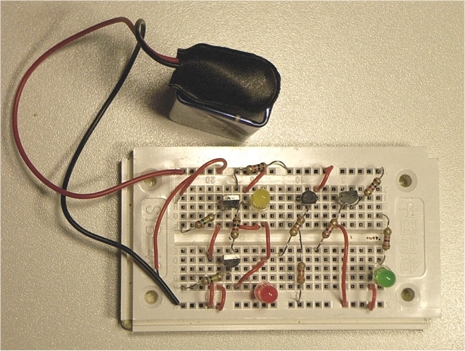 Im Bild sind die oben beschriebenen Schaltungen auf dem Experimentier-Steckboard des Elektronik-Adventskalenders aufgebaut.