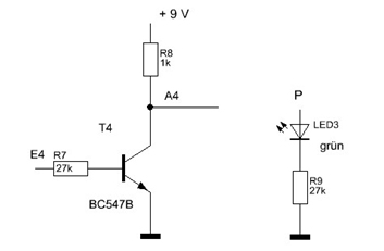 Die Leuchtdiode 3 mit ihrem Vorwiderstand von 27kOhm dient als Pegelanzeige. Ist ihr Anschluss P mit einem Punkt mit High-Pegel verbunden, leuchtet sie auf.