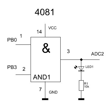 Überlegen Sie, wie Sie die noch freien UND-Gatter im 4081 auch noch anschließen müssten, um ein UND-Gatter mit 5 Eingängen zu erhalten. Wenn Sie die Funktion noch überprüfen möchten, müssen Sie allerdings zwei der Eingänge des 5-fach-UND-Gatters über je einen isolierten Draht mit VCC(+ 5V) verbinden, da Sie nur PB0, PB3 und PB4 des Mikrocontrollers, also nur drei Ausgänge schalten können.