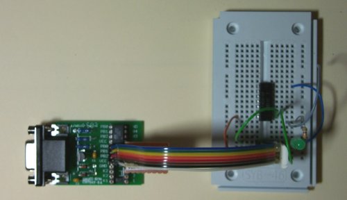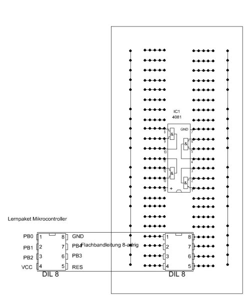 Folgende Verbindungen sind anschließend über isolierte Drahtstücke herzustellen : VCC mit Pin 14, GND mit Pin 7, PB0 mit Pin 1, PB3 mit Pin 2 , Katode (kurzes Ende) der Leuchtdiode mit GND, Anode (langes Ende)der Leuchtdiode über Widerstand 10 k an freie Kontaktreihe und von der ausgehend ein isoliertes Drahtstück als Prüfleitung für die Anzeige von Signalpegeln an einem Pin des Mikrocontrollers bzw. an einem Anschluss des 4081.